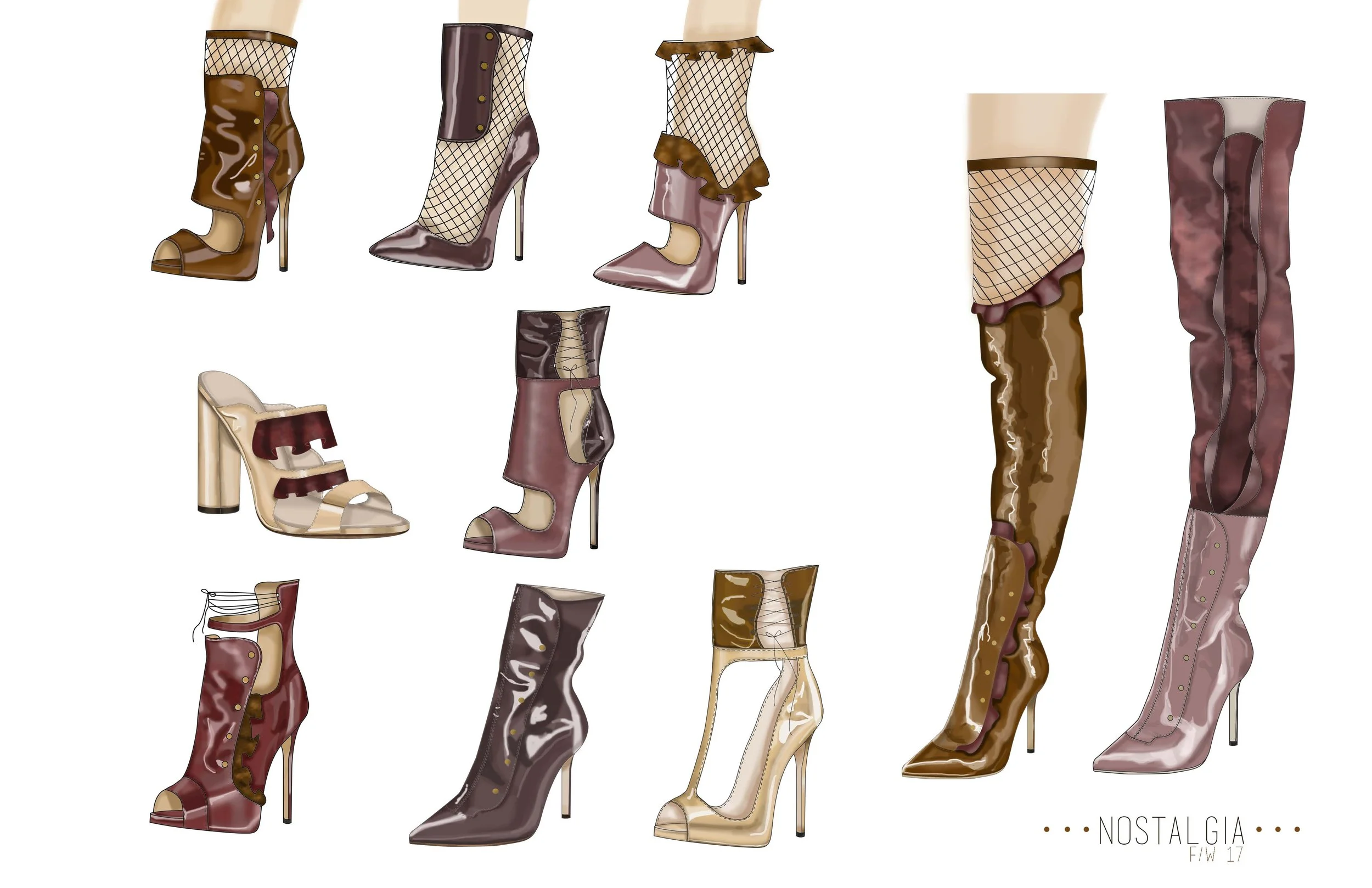 Nostalgia began with a glimpse of the past—a photo of my grandparent wearing elegant button-up boots. Inspired by this detail, I imagined a collection of high-heeled boots and sandals with button closures, creating a sleek, fitted silhouette. I added volume with soft suede ruffles and hints of sensual fishnet details, drawing on a boudoir aesthetic with corset-inspired lacing. The result is a collection that feels both coquette and bold, merging vintage refinement with a contemporary, alluring edge